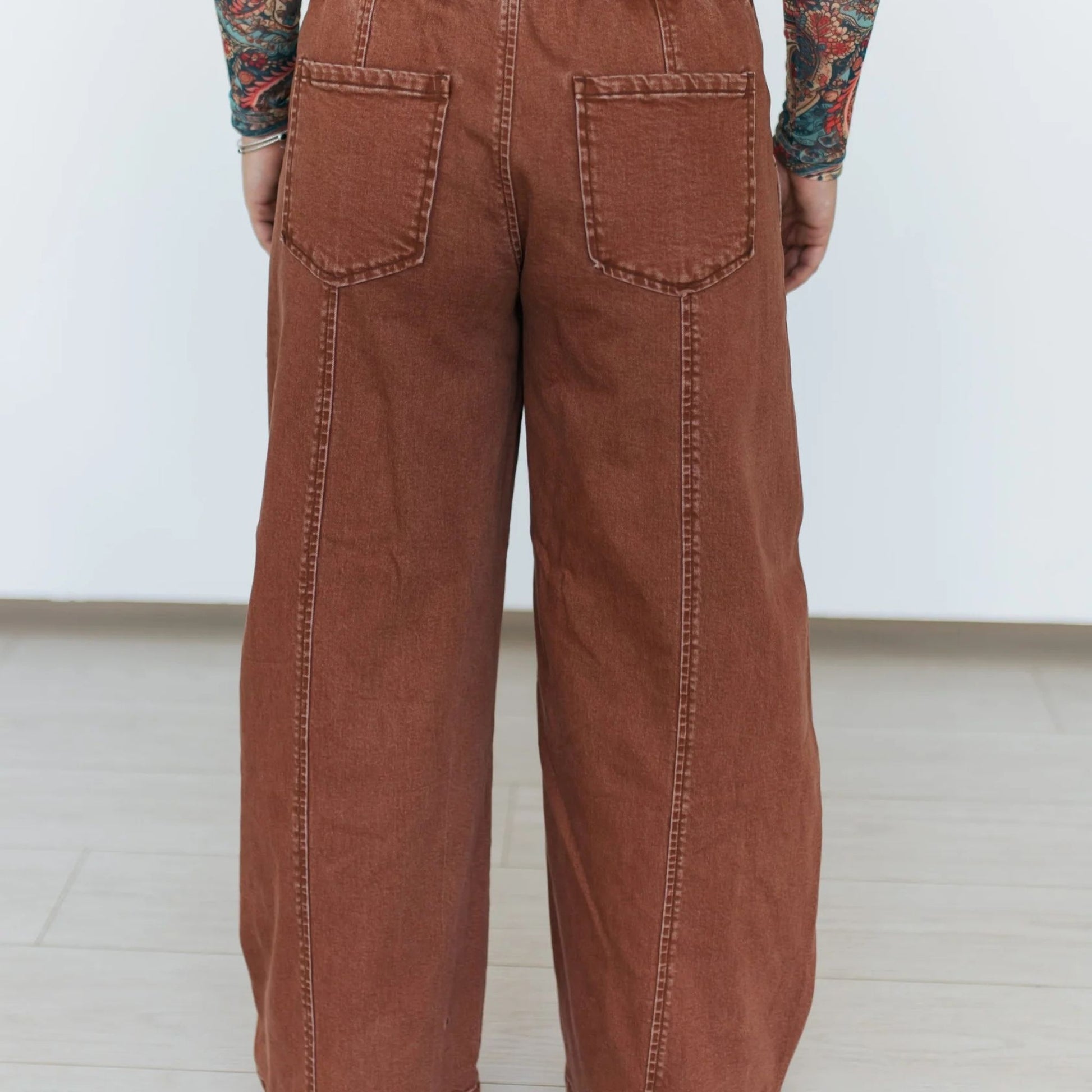 Add effortless style to your everyday looks with these relaxed wide-leg pants in a warm rust hue. They feature an elastic waistband with an adjustable drawstring for the perfect fit. The wide-leg cut offers easy movement and a laid-back vibe, while the side pockets add functional detail. Perfect for pairing with tees, sweaters, or button-downs, these versatile pants transition seamlessly from casual weekends to relaxed workdays.